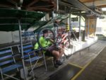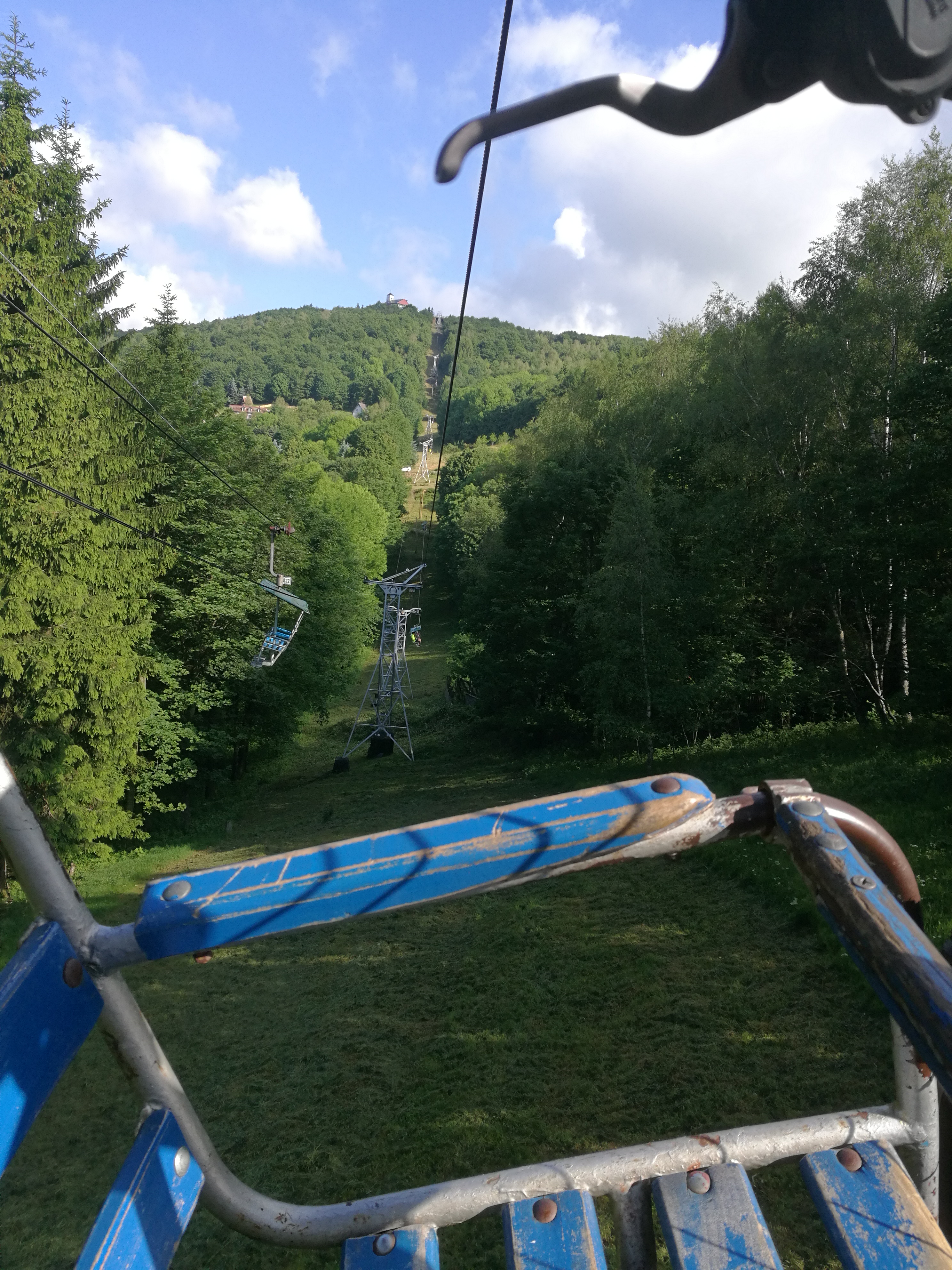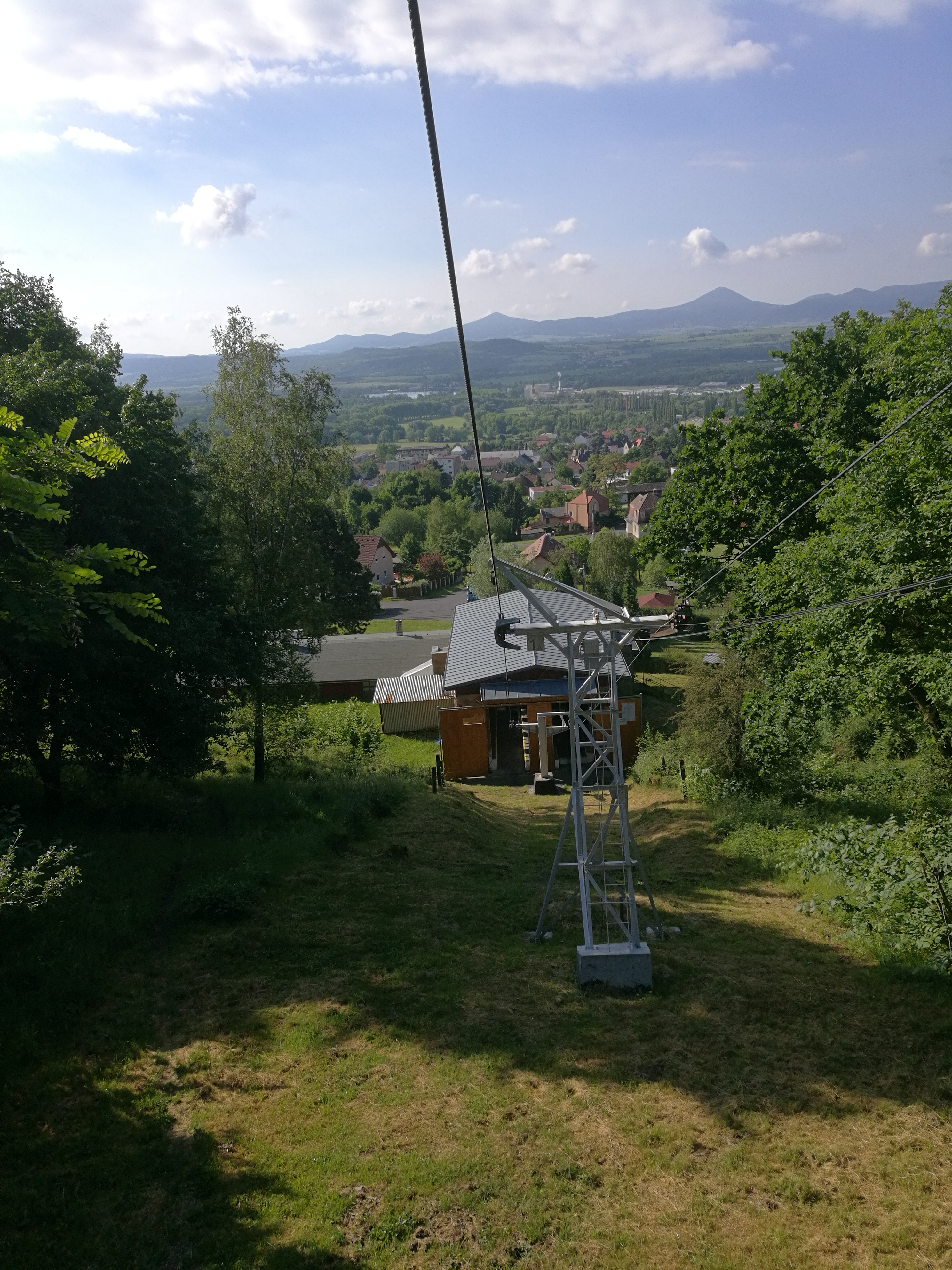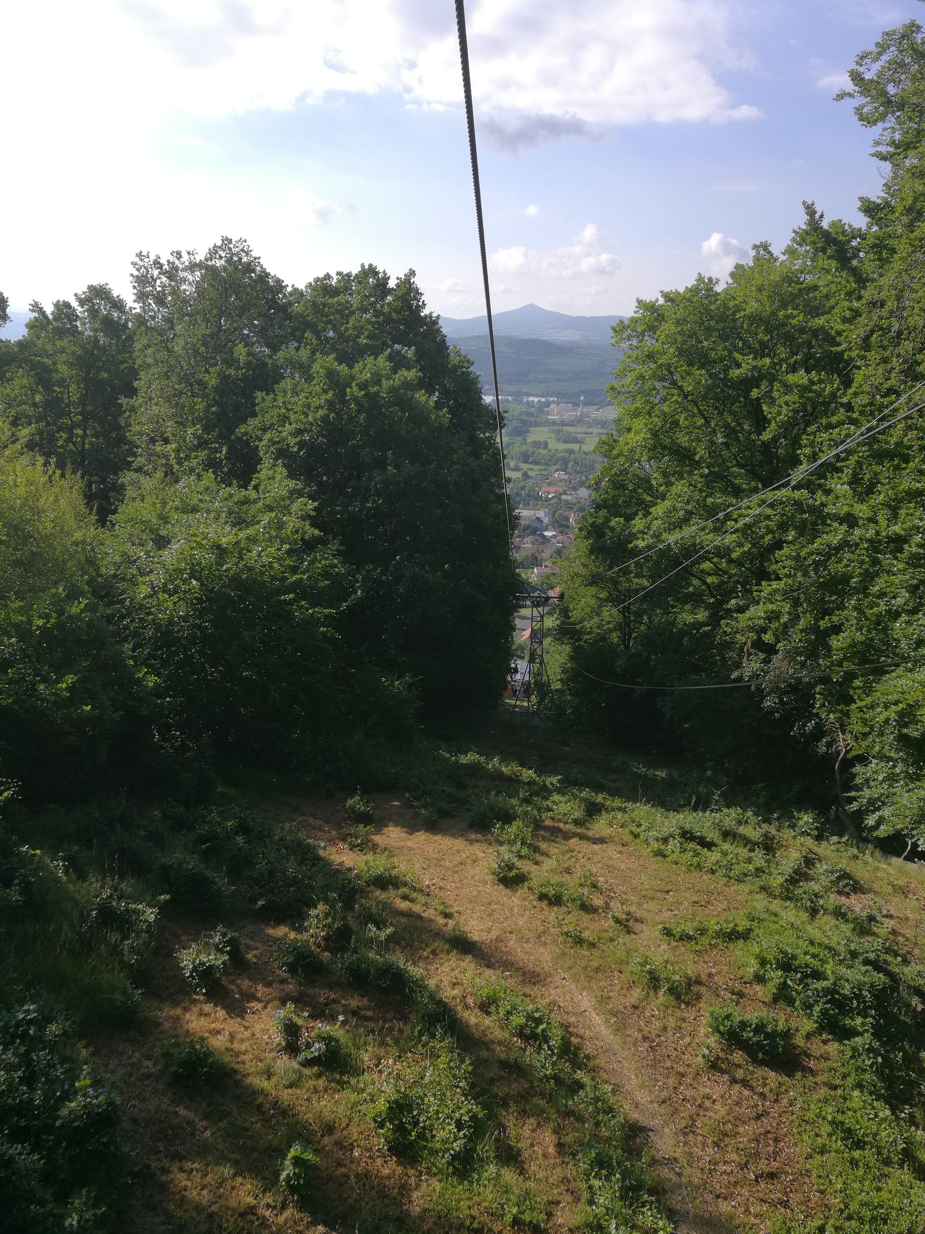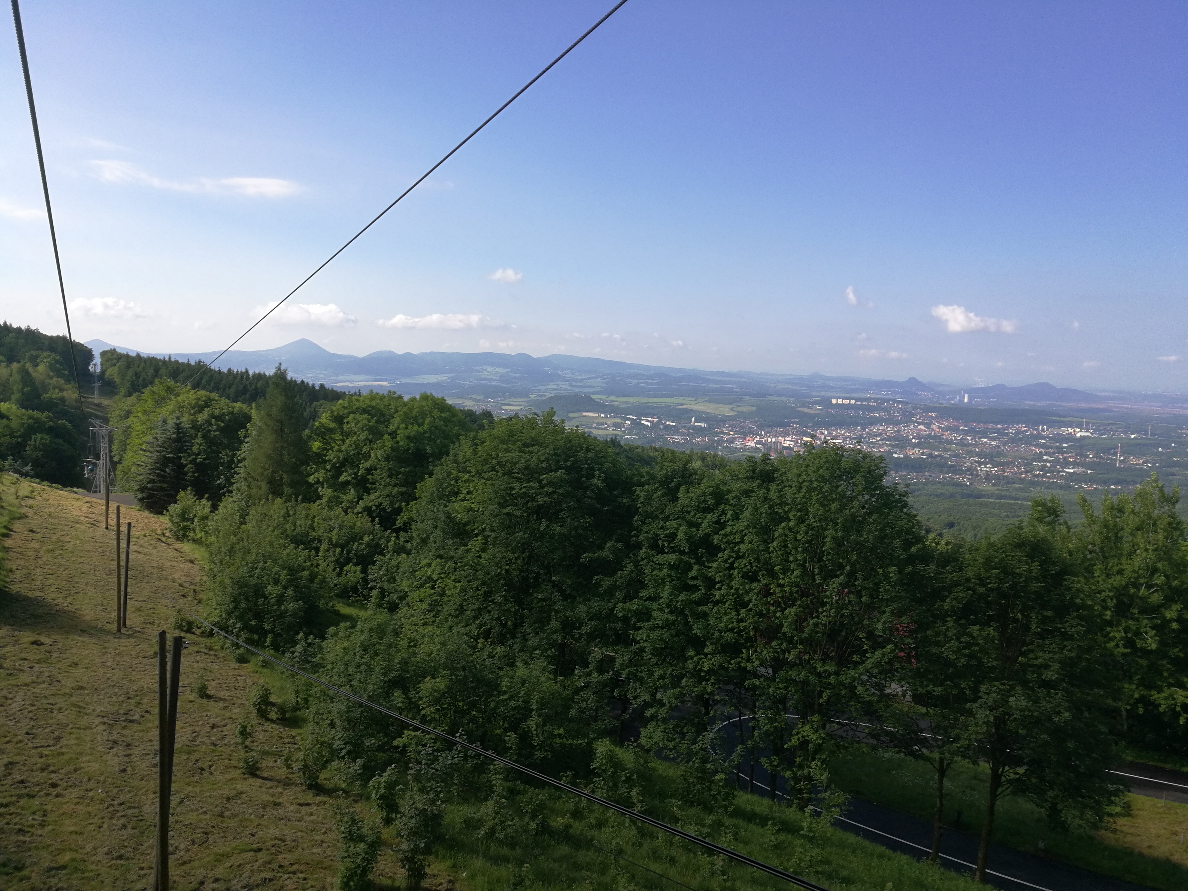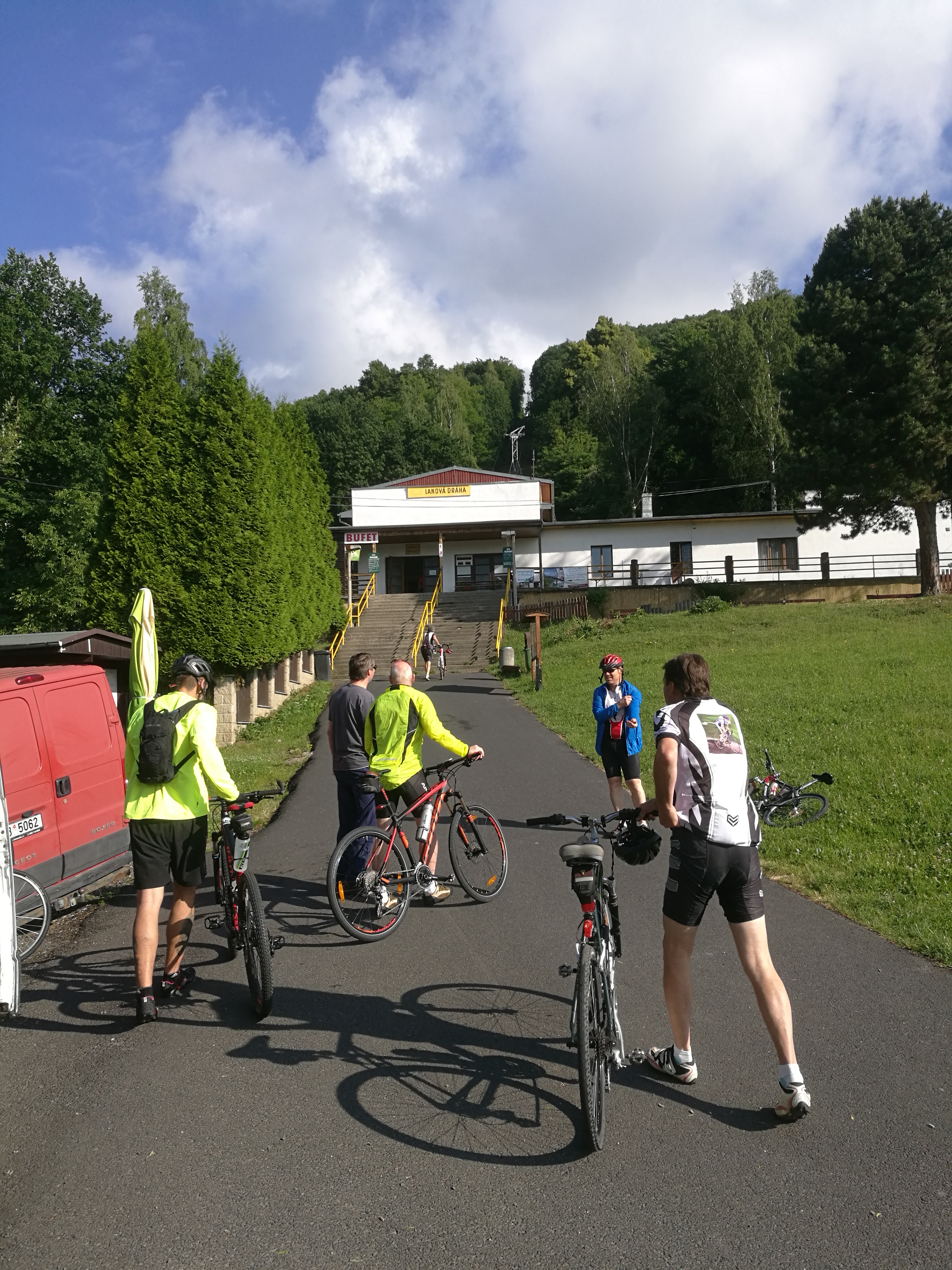 Ráno v 7 byl sraz u Kosmasu (trefili jsme tam jenom proto, že pro nás, Pražáky, přijel Petr na kole). Naskládali jsme sebe a kola do dvou dodávek, zaplatili 80 na osobu a jelo se do Krupky. Tady už čekal poslední, osmý člen týmu. Kilo za osobu a kolo a jede se nahoru. Je to cca 2,5 km a trvá to 15 minut. Je nádherně, takže fotím a doufám, že mi mobil nespadne.