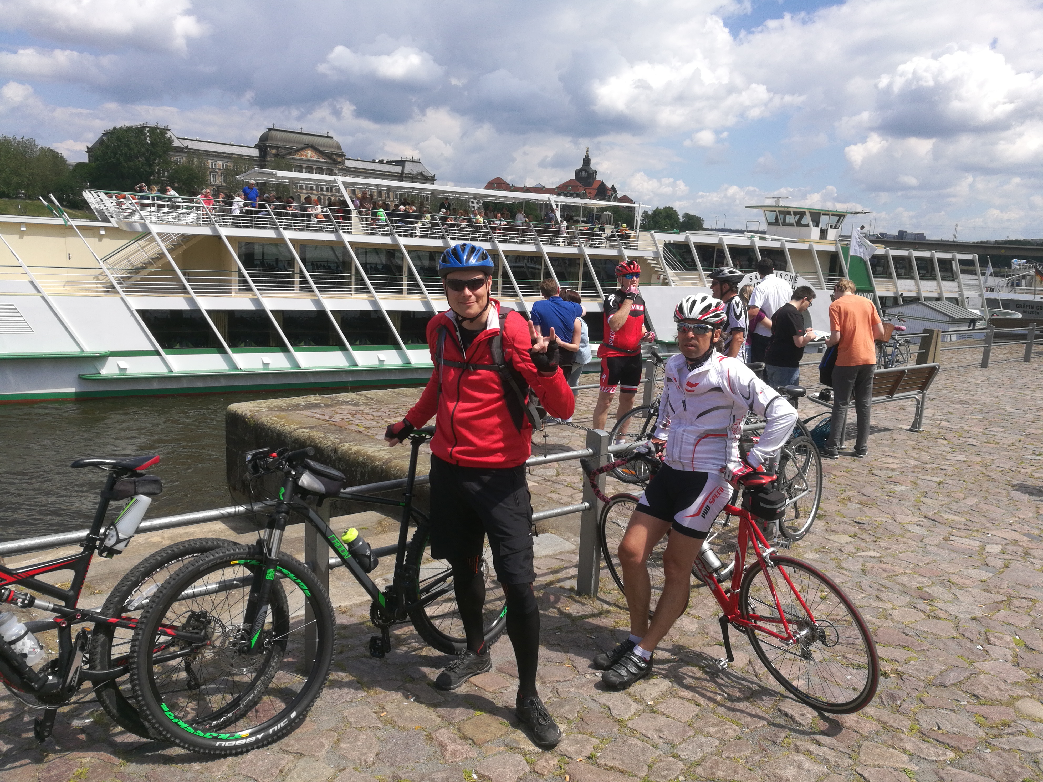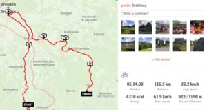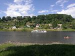 Nyní nás čeká cesta podél Labe až do Děčína. Jsem překvapen, že mi to na tlustých gumách docela jede a v podstatě udávám tempo. Určitě pomohl energy drink z hydrovaku i musli tyčky. Dokonce ani obávaná bolest v dlaních a prstech se neobjevila a záda jsem pocítil až po 70 km. Další zastávka je na 73km v Pirna, je tu příjemná zahrádka u cyklostezky. Pivko za 3,4 Euro.